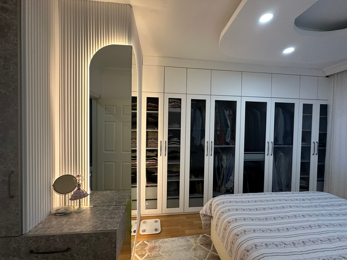 Bolca depolama alanı oluşturduğumuz bu yatak odasında, yalın bir dil kullandık. Yatak odasının kısmi L şeklinde olmasından kaynaklı makyaj masası ve dolaplar arasındaki bağlantıyı lambri ve aynalar ile sağladık. Genelinde beyaz rengin hakim olduğu yatak odasında makyaj masası ve komodinlerde taş desen kullanarak kontrast yarattık.